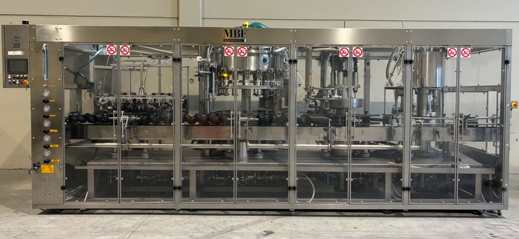 Compuesto por 20 pinzas de enjuagado, 20 grifos de llenado, encorchadora de 3 cabezales y taponadora, rosca de 3 cabezales, inertización incluidos, para una velocidad de 5000 b/h.
